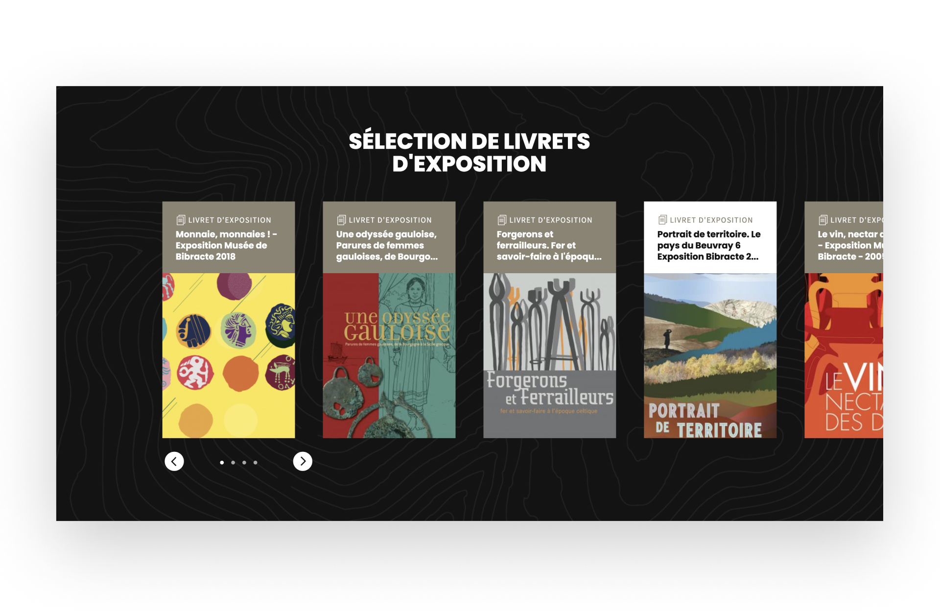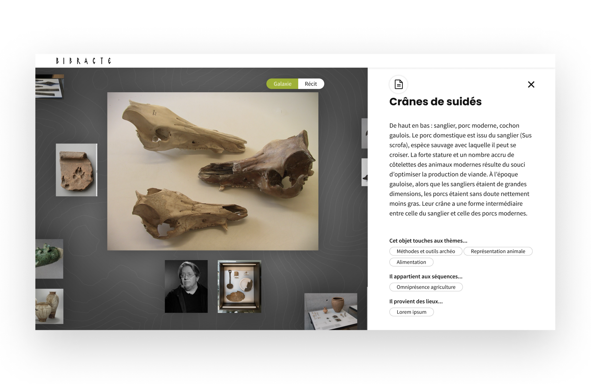 En 2021, j’ai défini une nouvelle identité graphique pour le site web de Bibracte, et ai réalisé le design de l’interface. Le site comprend une partie “galerie virtuelle”, qui permet aux visiteurs de découvrir les objets issus des collections du musée à travers une exploration interactive.