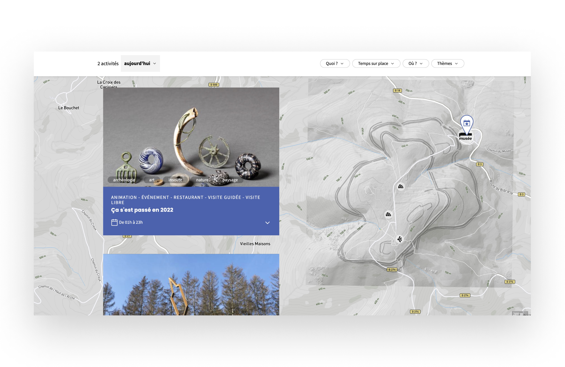 En 2020, j’ai réalisé le design d’interface du dispositif de visite embarqué “Les archives de la ville”, une application de réalité augmentée qui propose aux visiteurs d’explorer les reliefs du Beuvray pour y révéler les vestiges de l’oppidum disparu. Ce dispositif s’appuie sur une carte du territoire de 20 m² directement intégrée au sol.